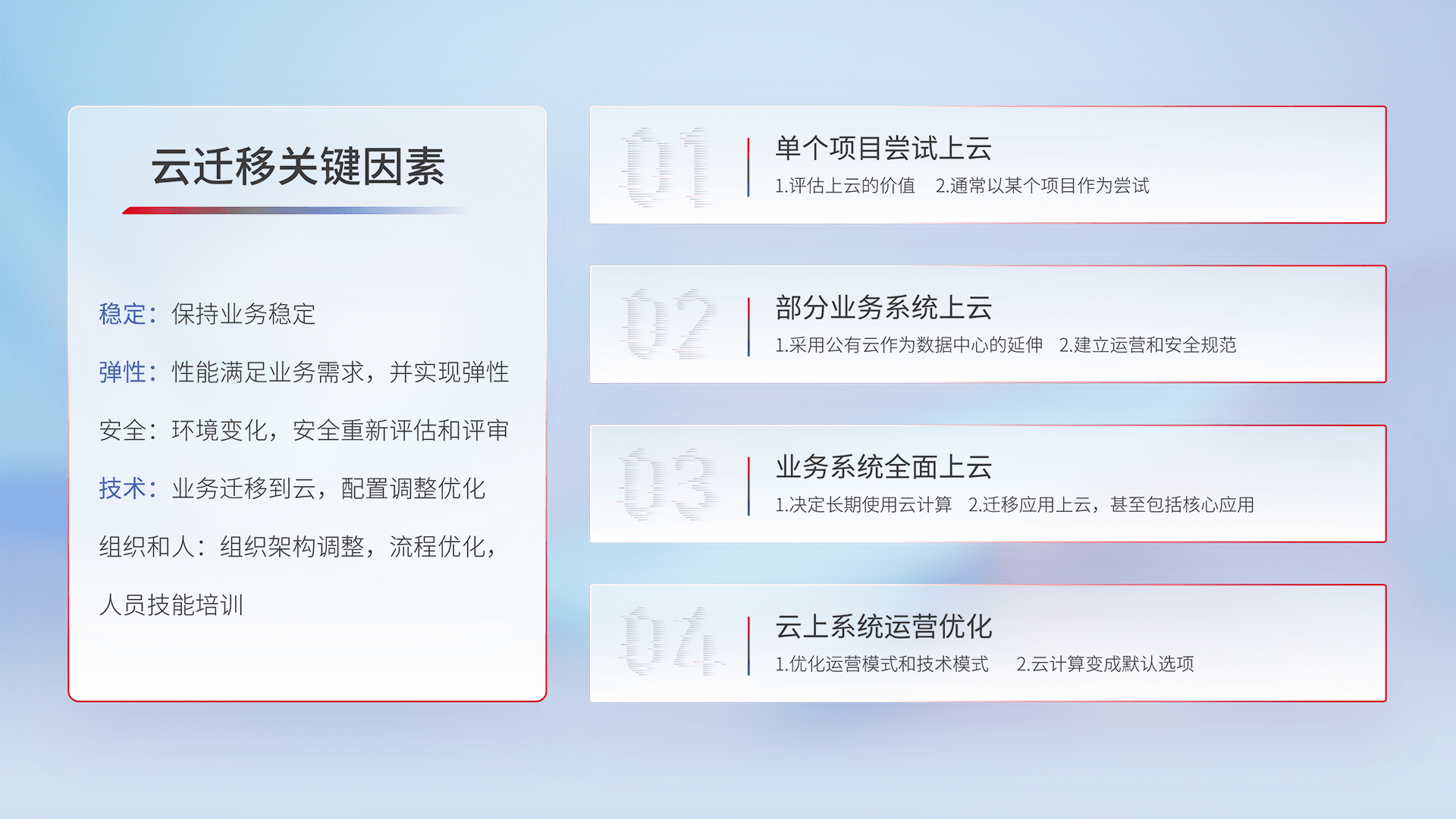 结合实际业务,,从规划设计、、、云平台选型、、、、云原生改造、、、、数据迁移、、集成交付,,,,迁移全过程为客户识别最佳上云路径,,做好风险识别管理,,,,设计网络架构、、身份权限、、安全审计合规、、、操作审计、、、日志审计、、监控告警策略、、多站点容灾设计等,,,对云上基础设施进行整体规划,,提升IT治理水平,,,,以满足弹性、、、高可用、、高性能的需求。。。